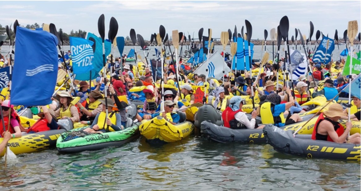 Rising Tide has the backing of 86 percent of Newcastle’s people, according to Newcastle Mayor Ross Kerridge. On water protesters defied possible $22,000 fines and two years jail under Section 214 of the Crimes Act, to block three coal ships. Many ships were diverted to other ports. 155 people were arrested.