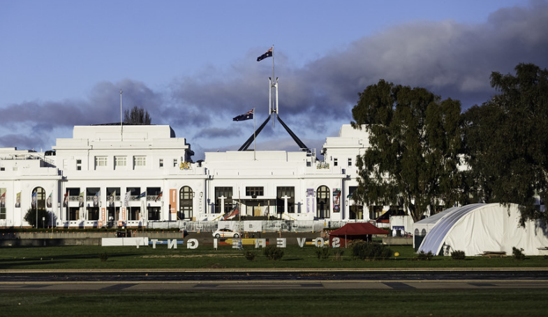 (Sovereignty banner faces parliament from tent embassy. Photo: Will E. Clicket Flickr Commons)